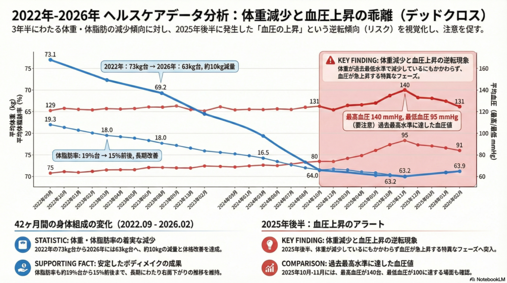 今日まで42ヶ月、約3年半という月日を一日一日の積み重ねで歩んできました。振り返れば、その道程は私の身体だけでなく、自分自身への向き合い方をも変える長い旅だったように思います。その計測結果をnotebooklmでまとめてもらいました。