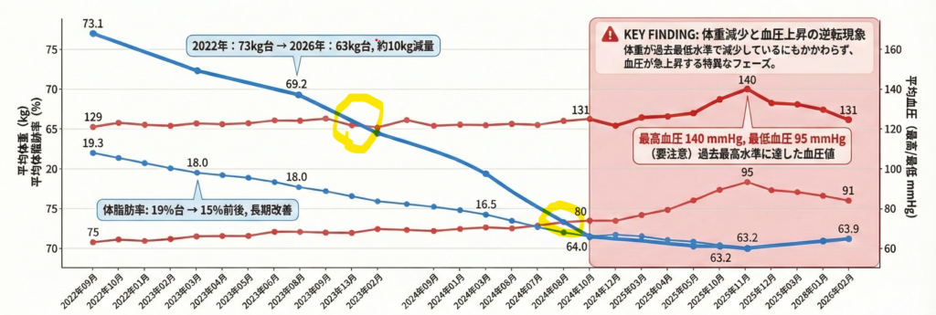 一般的に「痩せれば血圧は下がる」と言われます。私自身もその常識を疑ったことはありませんでした。しかし、私の手元にあるスマートフォンに蓄積されたグラフは、冷酷な現実を突きつけていました。体重のラインが下がり、血圧のラインが下がらずむしろ昇っていく。その二つが交差し、血圧が「高い」とされる警戒領域へと突き抜けていく。私はこの現象を、密かに「血圧デッドクロス」と呼んでいます。(下のグラフの黄色丸)このログを始めたきっかけのも血圧が上がったからで実はログの前は上が150ほどあったため通院して薬を飲んでいます。薬で落ち着かせてこのグラフです。